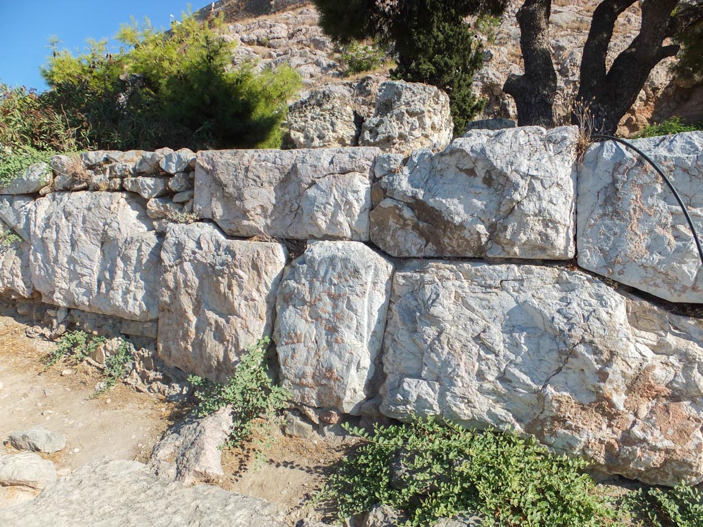 Per fugare questo dubbio, semmai ce ne fosse ancora bisogno, è da considerare la rilevante differenza di tecnica costruttiva esistente tra il muro poligonale di Milo e i muri in opera squadrata che sono presenti nella stessa roccaforte di Klima, chiaramente di produzione romana. Dalla parte opposta del teatro rispetto al lungo muro poligonale, si può ammirare infatti un muro di sostegno (Figura 14) con 14 corsi di pietre perfettamente squadrate, le cui singole altezze a partire dalla seconda fila dal basso e fino alla terzultima fila sono di 55,5 55,5 50,9 50,9 49,05 54,6 49,05 44,4 50,9 56,4 e 54,5 cm.