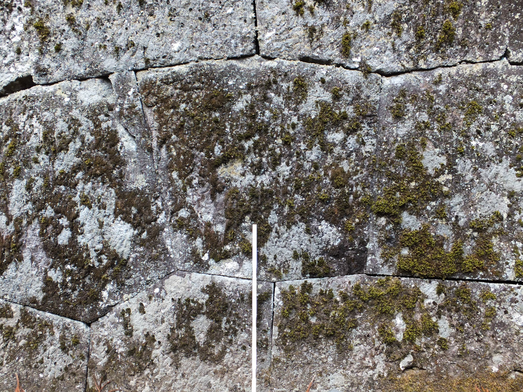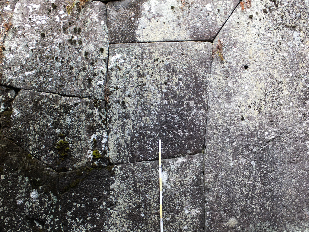 Oltre la porta del punto 9 la superficie del terreno è spianata. Al n. 17 della mappa c’è una piccola costruzione, detta “Ishimuro” (Figura 61), che si ritiene potesse essere un deposito di approvvigionamenti per il castello che si ergeva a breve distanza da qui; essa è formata da pietre perfettamente squadrate e appartiene al sesto tipo: basta osservare gli spigoli per accorgersi che sono perfetti, come solo un taglio può produrre. La Figura 62 ci mostra che queste pietre hanno avuto diversi trattamenti nella faccia a vista: dall’alto vediamo che una superficie è stata tagliata, due sono finemente martellate e altre due martellate grossolanamente; inoltre possiamo notare che due delle pietre finemente martellate presentano delle “maniglie”. Una terza pietra con maniglia è visibile sotto il cartello nella Figura 63, ma qui la maniglia, anziché trovarsi nella parte inferiore del blocco, come è la norma, si trova nella parte superiore. I dettagli mostrati, insieme al fatto che le tre pietre con maniglia sono state messe come in disparte, suggeriscono che il muro sia stato eretto utilizzando pietre riciclate.
