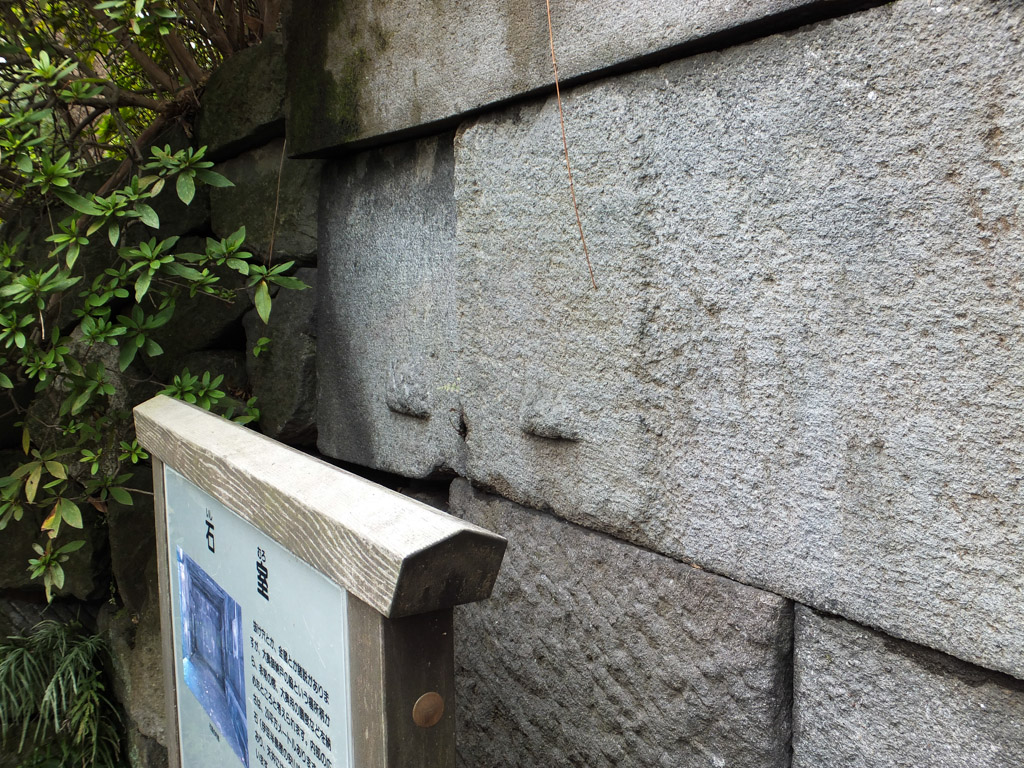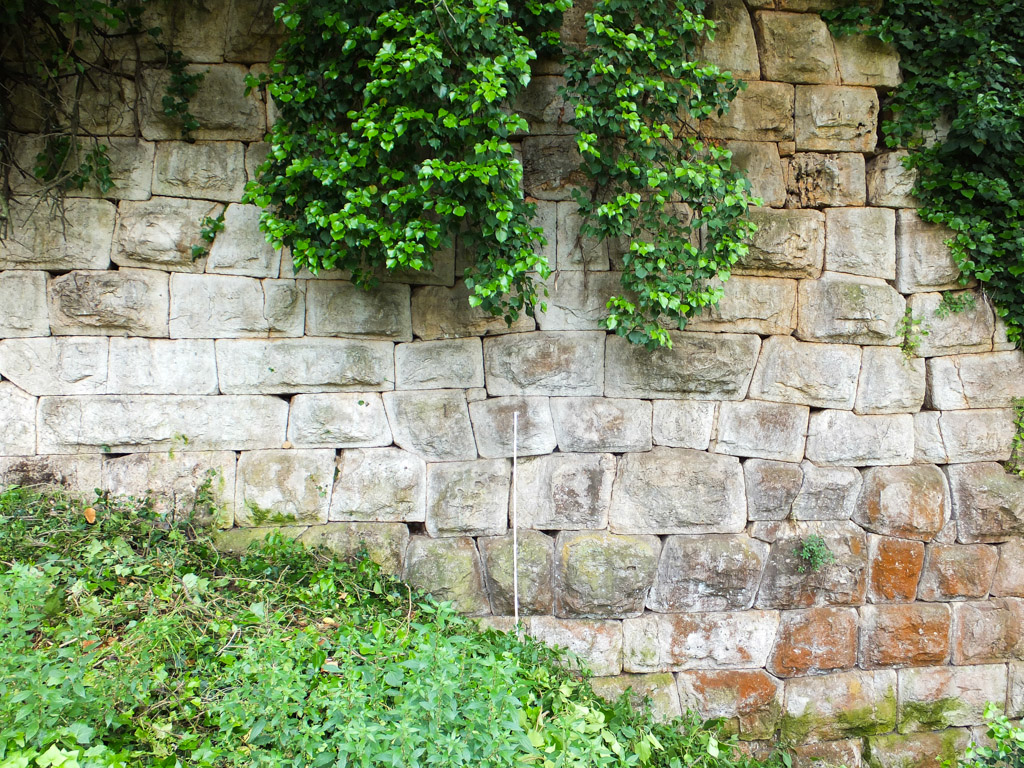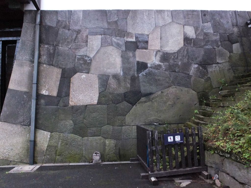 Tra le basi delle due discese Bairinzaka e Shiomizaka si estende un muro di 8 m di altezza (Figura 72), che fa parte della cinta difensiva interna. Un cartello ci informa che si tratta del rifacimento, eseguito tra il 2002 e il 2005, di un muro la cui costruzione originale è attribuita al 1656. Possiamo solo dire che il rifacimento, molto accurato, è stato fatto a imitazione del quinto tipo e che quindi l’originale doveva essere proprio del quinto tipo, ma con l’aggiunta di contatti talvolta imprecisi e qualche lato curvo, che ricorda l’opera lesbia. L’originale molto probabilmente era simile alla parete che si trova subito a sud del punto 31 (Figura 73) e, prossimo a questo, al muro della Figura 74.