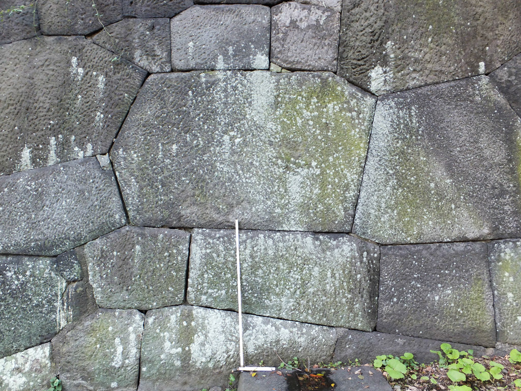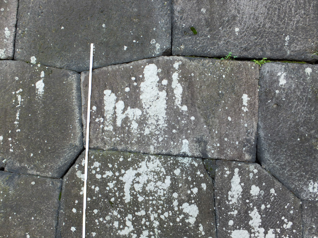 Al n. 26 si trova un’altra porta, dalla quale scende il declivio Shiomizaka. Gli stipiti della porta, come al n. 9, mostrano gli effetti di un incendio molto intenso. Lungo la discesa, sulla destra, si può notare che le pietre della parete tendono ad essere disposte su filari pressoché orizzontali (Figura 68 e 69), e questo ci consente di attribuire facilmente la costruzione al quinto tipo. Dal secondo filare dal basso sono state prese due misure: la prima, di 120,2 cm (78,25 dp), viene dalla pietra di Figura 70; la seconda, di 81,6 cm (53,125 dp) viene dalla pietra di Figura 71.