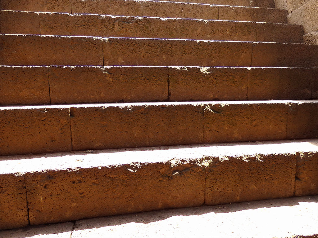 A Santa Cristina ho misurato l’altezza delle pietre dei primi 17 gradini dove era possibile infilare un listello al disotto del gradino per precisare la posizione della faccia inferiore, dato che ogni gradino poggia su quello inferiore (Fig. 43) e che le facce superiori dei suoi vari elementi (di altezza leggermente diversa tra loro) sono state disposte necessariamente allo stesso livello, lasciando così, spesso, sotto le pietre di altezza minore, un sottile spazio tra i due gradini, riempito di terra. Per ogni gradino le misure sono state da un minimo di 2 a un massimo di 7, iniziando dalla parte che si trova a destra scendendo. I dati, in cm, sono 1: 24,6-24,6-24,6; 2: 24,7-24,65-24.75-24,75-24,65-24,75-24,8; 3: 25,05-24,65-24,7; 4: 24,6-24,6-24,6; 5: 25,0-24,8-24,85-24,9-24,7; 6: 24,85-24,9-24,9-24,6; 7: 24,7-24,9-24,85-25,0-24,9; 8: 24,7-24,6-24,6; 9: 24,6-24,9; 10: 24,7-24,6-24,6; 11: 24,65-24,8-24,8; 12: 24,7-25,35-24,8; 13: 24,6-24,7-24,8; 14: 24,8-24,75; 15: 24,3-25,0; 16: 24,9-24,65-24,65-24,7; 17: 24,6-24,6-24,8.