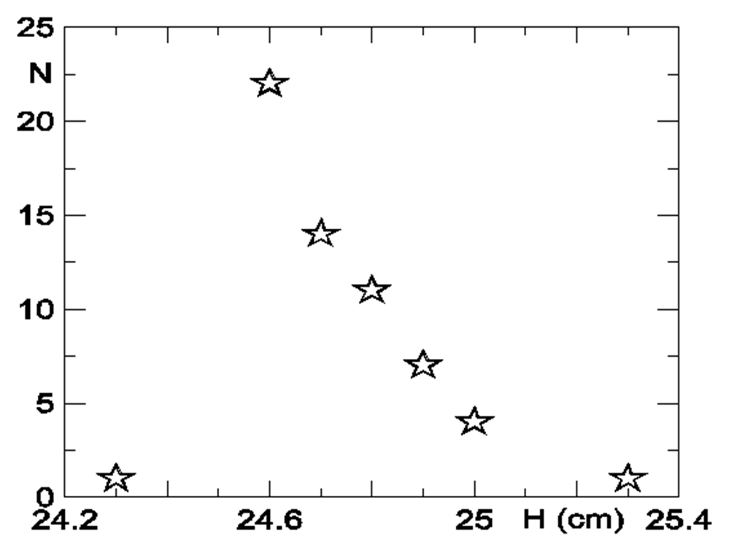 Per S. Cristina ho reso in forma grafica i valori misurati, approssimandoli a 1 mm e non a 0,5 mm come avevo fatto durante le misurazioni; ho ottenuto l’istogramma di Fig. 47, in cui in ascisse sono i valori di altezza H rilevati e in ordinate la loro frequenza N. Vi si osserva che praticamente il valore di 24,6 cm, oltre che essere il valore più frequente, è praticamente anche il limite inferiore delle misure, e come tale lo considero il valore che si intendeva ottenere. Esso corrisponde a 16,02 up.